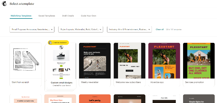 Mailchimp helps you to create text for headlines, paragraphs, subject lines, and more using the Generate tool found in the left-side menu. Just choose your content type, and Mailchimp’s email editor will offer helpful suggestions to save you time. Mailchimp also provides a solid collection of pre-built templates for emails, which are very easy to customize and use, and also very handy for the new users.