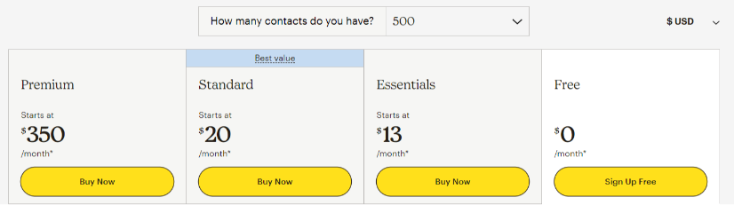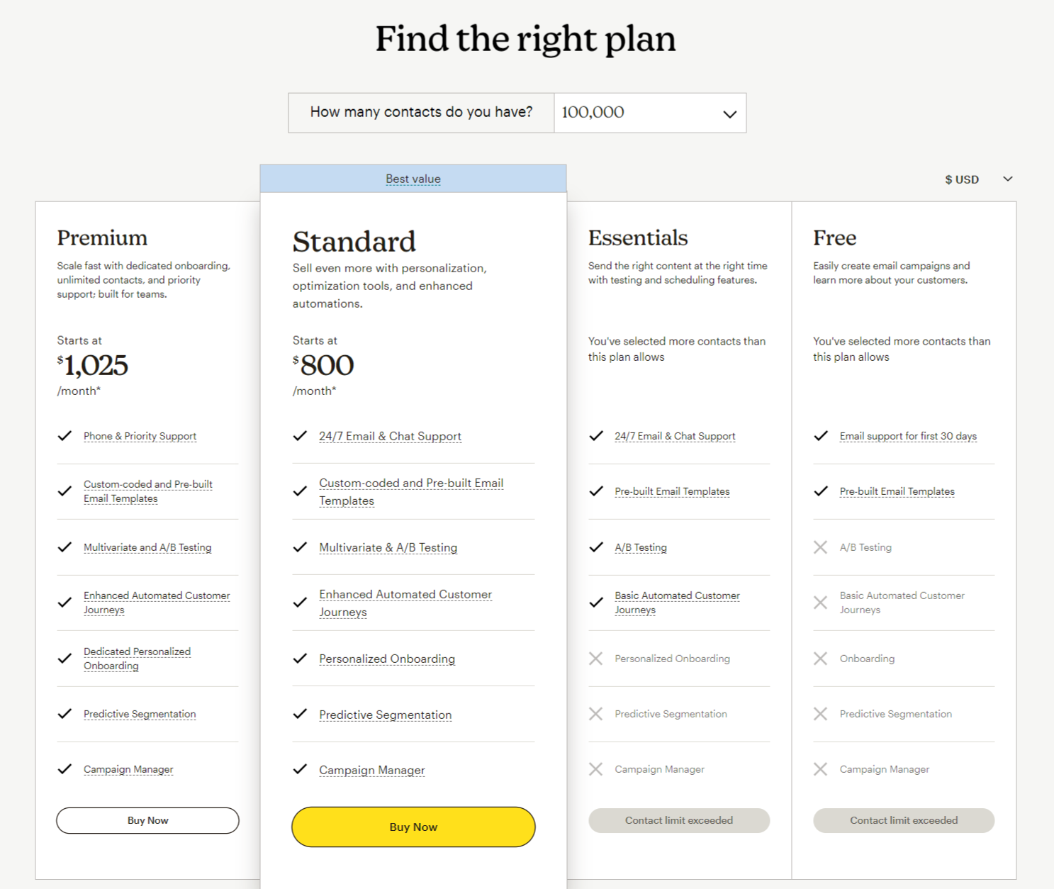 - Standard Plan: This mid-tier option includes everything from the Essentials plan plus advanced tools like send-time optimization and predictive segmentation. It starts at about $20 per month for 500 contacts, which makes it great for most small to medium-sized businesses.
